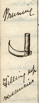 The vines are pruned in Feby leaving them from 2 to 3 feet high and one of the last years shoots one foot more, only leaving one branch (that is, no branch at all) and cutting this off next year and leaving a fresh one, every other branch is cut close to the stalk, the knife used for this purpose is exactly the same as the drawing in Bushey’s book, the soil is also cleared away from the roots for nearly a foot below the surface that no sprout may be left – To fill up vacancies in the Vineyards, a long branch is left on a vine, this is laid down below ground and led to the place where the fresh plant is wanted, then the end is turned up six inches above the surface, this grows the next year, being for the present fed by the parent Vine but in a short time takes root for itself Vines are also engrafted if the sort of vine is not that desired, or if a greater proportion of another variety is required, in this way the grape wished for is obtained much earlier than by planting fresh vines; a vine if well pruned and kept will last for many years – Among those who are particular about the quality of their wine and in the best Vineyards no dung whatever is used, except the fallen leaves of the vines, but in many vineyards Lupins are sown after the vintage to grow up and to be dug in in the Spring, even this was not allowed in the time of the old Wine Co., it is thought to injure fine wine, the husks and lees of wine are also used in some places where quantity is desired rather than quality – In most of the Vineyards the great proportion of the grapes are black and purple, but in the best, about one third are generally pale and white and Mr. F. thinks this should always be the case, and it is so in those Vineyards which produce the highest priced wine The names of the vines of which most of the vineyards are composed are as follows- 1 Bastardo } 2 Aloarilhão } 3 Touriga } Black 4 Souran Tinto Cas } 5 Tinta de Mina } Purple 6 Barretto de Clerigo } & 7 Tinta Francisca } Dark 8 Mourisca } grapes