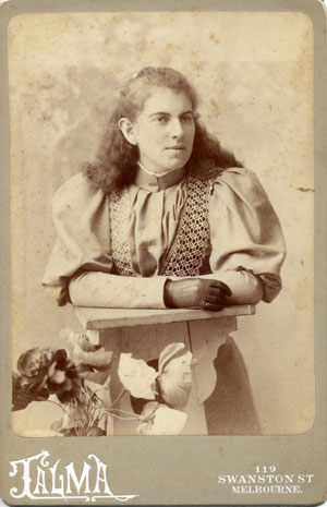 Right: : Mary Ellen Jobson (Nell), aged 17. 29 January 1895. Photographed by Talma, 119, Swanston St Melbourne.