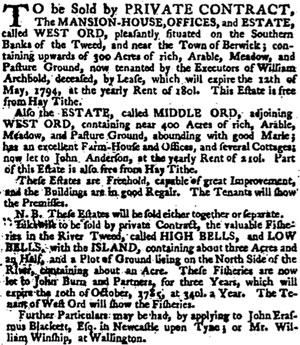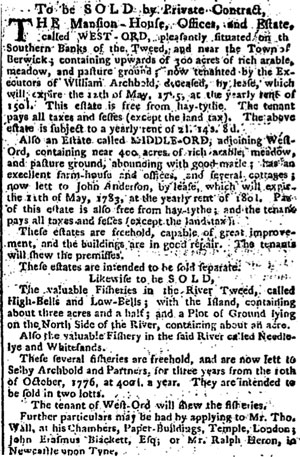 To be SOLD by Private Contract, THE Mansion- House, Offices and Estate, called WEST ORD, pleasantly situated on the Southern Banks of the Tweed, and near the town of Berwick; containing upwards of 300 acres of rich, arable, meadow and pasture ground; now tenanted by the Executors of William Archbold, deceased, by Lease, which will expire the 12th May, 1785, at the yearly rent of £150. This Estate is free from hay tithe.The tenant pays all taxes and Fesses (except land tax). The above estate is subject to a yearly rent of £2.14s. 8d. Also an Estate, called MIDDLE-ORD, adjoining West Ord, containing near 400 acres of rich, arable, meadow and pasture ground, abounding with good-marle ; has an excellent farm-house and offices, and several cottages; now lett to John Anderson by lease, which will expire the 11th May, 1783, at the yearly rent of £180. Part of this estate is also free from hay- tythe; and the tenant pays all taxes and fesses (except land tax).These estates are freehold, capable of great improvement, and the buildings are in good repair. The tenants will shew the premises. These estates are intended to be sold separate. Likewise to be SOLD, The valuable Fisheries in the River Tweed, called High-Bells and Low-Bells, with the Island, containing about three acres and an half, and a Plot of Ground lying, on the North side of the River, containing about an acre. Also the valuable Fishery in the said river, called Needle Eye and Whitesands. These several Fisheries are freehold, and are now let to Selby Archbold and Partners, for three years, from the 10th October, 1776, at £400. a year. They are intended to- be sold in two lotts. The Tenant of West-Ord will shew the Fisheries. Further particulars may be had, by applying to Mr Tho. Wall, at his Chambers, Paper-Buildings, Temple, London; John Erasmus Blackett, Esq; or Ralph Heron, in Newcastle upon Tyne. The Newcastle Courant.11/07/1778 & 15/08/1778 & General Evening Post (London), September 15, 1778; Issue 6977. Classified advertisements.