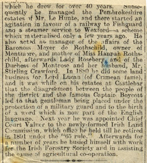 May and June with Mr. Le Hunte who made me his Agent, and visiting his estates in Pembrokeshire and settling about farms and quarries and starting agitation about a railway to Fishguard and sea passage to Wexford, which has finally been carried out by opening of traffic from London by Fishguard and Wexford to Cork in September, 1906.