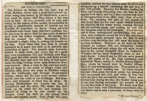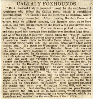 Note The Callaly, which were started by Harry Brown at the beginning of this season, hunted part of the Percy country but were given up at the end of the season. They were hunted by Luke Gilhorne, late kennel huntsman and first whip to Mr. Grey. At the end of this season Major Hunter gave up the Berwickshire hounds and they were taken by Sir James Millar. He sacked Harry Chowles and took on Finch (late first whip to Ld Middleton’s) as huntsman.