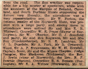 October 9th Neasham 9 A.M. Found a mangy cub in the East and West flats and after hustling him for a bit he broke away and ran over to Birch car where they lost him. Found several more cubs in Maidendale whin and ran them backwards and forwards from one plantation to another and eventually killed an old fox at the rifle butts. Rode the bay pony. October 11th Croft 9 A.M. Found several cubs in Dalton Wood but did not kill one. Chopped a cub in Forty acres. Drew Black Man and Collings whin blank. Rode the bay pony. October 18th Girsby 9 A.M. Drew Hugill’s young plantation and Beverley Wood blank. Found in Allan’s plantations and ran for a few fields towards Enter Common and back into the plantations and lost him. Drew Longroofed-house blank. Found in the whinny field adjoining and ran along Beverley wood to Allan’s plantations and lost him. Rode “Monica.” October 21st Middleton Tyas 10.30 A.M. (Zetland) Found a good show of cubs in the plantations near the village and killed one. Drew Church whin and Incle whin blank. Found several cubs in Allan’s whin and ran pretty smartly to Clerveaux and lost him. Rode the bay pony. October 23rd Welbury 10 A.M. Drew Welbury whin blank. Found an old mangy fox in Welbury plantations and ran it for about four fields to the south and lost it. Found another old fox in Wales’ whin but did not let hounds go. Drew the Rownton plantation blank. Rode “Monica.” October 25th Oak Tree 10 A.M. Found an old fox in Church Whin and ran towards Chapman’s plantation and lost it. Found another in Burn Wood and ran pretty fast to Harrison’s Gill and on to the river a little way above Aislaby where hounds crossed over. All but 4 ½ couple came back and the rest went on to Kirklevington. Rode the bay pony. November 18th Sadberge, 11 A.M. Drew Bumper Hall whin blank. Found a mangy fox in Fighting Cocks whin and ran him in a ring to Bumper Hall whin and lost him. Found another in Fighting Cocks and killed him in the first field as he had a broken leg. Drew Goosepool plantations and Ld Londonderry’s whin blank. Found in Burn Wood a ran to Long Newton, then along the lane side nearly to Goosepool plantations, then over the lane to the right towards Fighting Cocks for two or three fields then to the left again and ran him to ground between Dent’s house and the slag heap. Drew Burn Wood again and Elton plantations blank. Found a mangy fox in Elton whin and ran him past Elton, through the Quarry wood and killed him in a garden at the back of Long Newton. Rode “Monica.” November 20th Halnaby 11 A.M. (Zetland) Drew Forty Acres, Birch Car, Walmire and Walmire Bottoms blank. Found in Natras’ whin and ran down the railway side to Straggleton Gate then turned back over the bottoms past Nattras’ house to a field drain near Walmire where he got in. Drew big and little Stranbroughs blank also the Castle Wood and Bulmire whin. Found in Allan’s whin and ran back to Bulmire and lost him. Drew Allan’s again but did not find another. Drew the plantation near the tile sheds at Halnaby blank. Found in Inkle whin and ran through Allan’s whin past Bulmire, through the West Wood and back through the Ell Wood and Allan’s whin and back again to Bulmire and lost him. Rode “Monica.” November 22nd Over Dinsdale. 11 A.M. Drew Over Dinsdale wood, Scar Hill, and Pease’s plantations blank. Found a fox in Worsal whin and ran him over the road and lost him. Drew the whin again blank, also Long Roofed house plantation and Staindale gill. They afterwards found in Beverley Wood and ran to Worsal Village and lost him. Rode “Monica.” November 28th Oak Tree 11 A.M. Drew Church whin blank. Found in Chapman’s plantations and ran in a ring towards Church whin then towards Newsham banks and back to Chapman’s and lost him. Drew Newsham banks and Harrison’s Gill blank. Found in Farrar’s whin and ran past the back of Eaglescliffe over the railway near Eaglescliffe Junction then turned to the left past the back of Urley Nook and along the railway side for about a mile, then turning again ran straight back through Farrar’s whin but the fox was beat and turned back into the whin and hounds killed him. Drew Burn Wood and Ld Londonderry’s whin blank. Found in Goosepool and ran towards Church whin but leaving it on the left they turned and ran through Chapman’s plantation, over the railway through Goosepool plantation, Ld Londonderry’s whin and on towards Long Newton, leaving it to the right they turned again and ran over the road as if for Fighting Cock’s whin then back over the road in the direction of Oak Tree but as it was getting dark they were stopped. Rode “Zetilla.” December 2nd Neasham 11 A.M. Found a fox at Neasham Hall and ran him through Surtee’s plantation and Bolton Park then back through Surtee’s plantation, Dinsdale Wood and Wilkinson’s then over the road into Scurfield’s where they changed. Found several more foxes and ran round and round between Surtee’s, Wilkinson’s and Scurfield’s plantations. Rode “Ginger.” December 4th Melsomby 11 A.M. (Zetland) Drew Melsomby whin and the plantations adjoining blank. Found in Hang Bank plantation and ran towards Barton then turned and ran back past Hang Bank, through Stanwick and on to Small Ways and lost him. Rode “Monica.” Left hounds at Hang Bank as Monica fell into a ?road and cut her knee. December 11th Willow Bridge 11 A.M. (Zetland) Drew Stapleton whin blank. Found on Stapleton banks and ran across towards Clerveaux but the fox was headed on the Barton Road and then ran towards Jolby. Crossed the road and on to Allan’s whin. He turned again at the whin and ran towards Newton Morrell but was headed again at the road and ran to the south end of Barton then turned and crossed the road between Barton and Newton Morrell and ran on over Clow beck past Brettanby to Lucy Cross, then back past Brettanby and on past Hang Bank to Melsomby where hounds lost him. Rode “Zetilla.” D