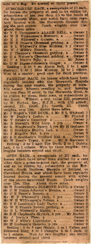January 11th Croft 11 A.M. (Put off from Thursday 10th on account of frost) Drew Dalton Wood, Black Man whin, Collin’s Whin, Forty Acres, Allans Plantations and Beverley Wood blank. Found in the big wood at Over Dinsdale and ran for a couple or three fields towards Worsal Whin and lost him. Found another in the big wood and ran up the river side to Over Dinsdale Hall and lost him. Rode “Ginger.” January 18th Halnaby 11 A.M. Zetland. (Put off from Thursday 17th on account of fog.) Drew Forty Acres, Walmire and Natress’ whin blank. Hounds hit off a stale line outside the whin and ran towards Dalton Station for a couple of fields but the fox had been gone too long. Found on Walmire Bottoms and ran towards Kirkbank but turned to the right and ran to Forty Acres. They had a line on the far side of the plantation but could not run it. Drew Moulton whin blank. Rode “Kestrel.” January 22nd Oak Tree 11 A.M. Drew Church whin blank. Found an outlying fox on the way to Neasham banks and ran him slowly nearly to Farrar’s whin and lost him. Found five foxes in Farrar’s whin and got away with the last one and ran him over the railway near Early Nook then on to Elton then turned right handed as if for Burn Wood but turned to the right again past Early Nook and back into Farrar’s whin. After hounds had been in the cover about a quarter of an hour a disturbed outlying fox came in but was headed off the whin and we ran him down to Eaglescliffe Junction and lost him. Rode “Ginger.” February 9th Aislaby 11 A.M. Found in Farrar’s whin and ran through Harrison’s Gill and along Newsham banks and out towards Low Middleton but coming out of Newsham banks hounds were close at him and he doubled back towards the banks and killed him at the farm. Drew Harrison’s Gill blank. Found again at Farrars and ran over the railway and lost him at Goosepool. Drew Burn Wood and Elton blank. Rode “Ginger.” Feb. 11th Stapleton 11 A.M. (Zetland) Drew Stapleton whin, Ell Wood, Castle Wood, Gill, Big Stranborough, Walmire and Walmire Bottoms blank. Found in a hedge 50 yards from Natress’ whin and ran through the cover to Dunn’s house and killed him. Drew Moulton whin, Forty Acres, Birch Carr, Black Wood, Bulmire whin, Allan’s whin, Brettanby whin and Hang Bank plantation all blank. Rode “Monica” and “Kestrel.” Feb. 19th West Hartburn 11 A.M. Found at once in a hedge close to the house and ran a slow hunting run past Goosepool round by Fox Hill and back past Bumper Hall whin and Fighting Cocks whin to ground in a drain on the railway. Drew several other fences at W. Hartburn without finding another. Found in Fighting Cocks whin and ran to the road between Burdon and Sadberge and lost him. Drew the fences about Burdon without finding and then went back to the fox we had run to ground in the drain, bolted him and ran to Fighting Cocks whin and killed him on the roadside. Drew Geo. Scurfields Far plantation blank. Found in Maidendale whin and ran through the plantations to Birch Carr, where we probably changed, the run fox going over the road to Wilkinson’s cover, the fresh one ran round by the rifle range and the back of Neasham gardens past Neasham Hill farm in Surtee’s big wood then round in a ring by Dinsdale and back into the big wood and eventually lost him about Sockburn. Rode “Monica” and “Ginger.” Feb. 21 Moory Bank. 11 A.M. Found at Saltergill and ran past Kirklevington and down to the Leven and lost him. Drew young plantation at Craythorne and Trenholm Bar whin blank. Got onto the line of a fox in Trenholm plantation and ran across the road to the Leven when he was viewed and ran back past Trenholm over the railway and on to West Rownton Railway Gates where we lost him. Got onto the line of another fox which had slipped away from Worsal whin and ran him past Long Roofed House, down Staindale Gill past Girsby to Over Dinsdale Wood, then down to Fardeanside and lost him. Rode “Kestrel.” Feb. 26th Middleton-one-Row. 11 A.M. Found in Church whin and ran to ground at once in the sewer drain of the new Asylum. Drew Newsham banks and Harrison’s Gill blank. Found in Farrar’s whin and ran very slowly to within a field of Church whin and then back by Aislaby to Farrars whin and lost him. Cold rain and no scent. Rode “Ginger.” Feb. 28th Welbury Station. 11 A.M. Found in Welbury whin and ran pretty fast to Arncliffe wood and lost him. Drew Rownton plantations and Welbury plantations blank. Also Deighton cover and several plantations blank. Found in one of the Deighton plantations and ran to the Northallerton road then turned right handed and ran back to Deighton village and lost him. Rode “Kestrel.” March 2nd Sadberge, Newton Grange (Wear Valley Harriers) 11.30 A.M. Found a hare close to the house and ran through Fox Hill cover than doubled back and crossed the road onto the Sadberge bottoms and lost her. Found another near Barkers plantation and ran to the plantation and lost her too. Drew round by Woogra, Newbiggen and Ketton blank. Rode “Ginger.” March 5th Neasham. 11 A.M. Found in Surtees’ big wood and ran down by Dinsdale’s back by the Fish Locks but scent was very bad and we lost him somewhere about the big wood. Drew Tom Wilkinson’s cover blank. Found in Birch Carr and killed in the wood outside the whin, a vixen. Found again in Maidendale whin and ran along the stell where the fox was headed by men on the railway and turned back into the Far plantation then back towards Fighting Cocks where he was headed again and ran back past Maidendale wood and on towards Darlington but we lost him in about five fields. Drew Fighting Cocks whin blank. Found in the new whin at Bumper Hall and ran slowly to Long Newton then turned to the right into Burn Wood where a lot of time was lost in casting hounds towards the Early Nook road, they eventually hit off the line on the other side of the wood and ran to Goosepool plantations but he had been gone too long. Rode 