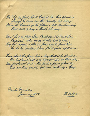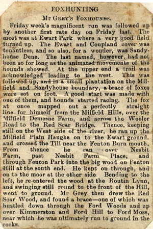 August 26th Red Scar-5 A.M. Found several cubs in Ford Woods but did not kill any there. Found three in the red scar wood and killed two of them. August 29th Ewart Wilderness 5.15 A.M. Not many cubs. Killed one in the potatoe field outside and ran one out past the Thirlings but had to whip off on account of standing corn. Coupland drive blank. September 9th Sandyhouse Dene-6 A.M. Drew the Dene blank, found in a turnip field outside Lanton Dene and ran round Lanton Hill and back into the strip, out again on to the hill and to ground. Found again in the Dene and ran out onto the hill and last. Plenty of cubs but a shocking bad scent September 13th Milfield Hill 6 A.M. Found several cubs in Flodden Strip and killed one. Drew Housden blank. Found a great number of cubs in the Far plantation but did not kill any. Found again in Redesford Whin, but could not run. Scent good at first.September 19th Fenton Wood-6.30 A.M. Ran out to the Horse Bog earth with an old fox and lost. Ran another one out by Fenton Hill and lost. Scent good at first but failed utterly. G. G. unable to Hunt. Mr. Lambton hunted the hounds. September 27th Sandyhouse. 6.45 A.M. Sandyhouse Dene blank. Found in Lanton Dene and ran down Lanton strip across two fields behind the Lanton Herd’s house and back into Lanton Dene down the strip again, out onto the hill towards Crookhouse, but turning back went to ground in a rabbit hole just outside Lanton Strip where Quits and Venom killed him. Ground very hard and dry. Very little scent. September 30th Cannomill Bog. 7 A.M. Found at least six foxes in the bog. The first one got away over the Railway in spite of the efforts of the Station Master and other officials to keep him in. The next one tried very hard to follow the first but hounds killed him as he was going through the rails out of the bog. Two went away on the Bowmont side. Another was killed and one was left. Scent moderate. October 2nd Paston (Berwickshire). 7 A.M. Found in the plantation above the road but hounds could make nothing of him. Found several cubs in the Lake Plantation and killed one. Scent very bad. In spite of half an inch of rain ground still very hard. October 7th Fenton Mill. Drew the plantation behind Jones’ house for a lame fox which we did not find. Found in Fenton Wood but could not run a yard. Found a brace in Kimmerston Dene but had to leave them. The worst scent this season. October 11th Milfield. Found in the Flodden strip but did not let hounds away. Drew the far Plantation, Housden, Reedsford, Crookhouse, Lanton Hill, Lanton Dene and Sandyhouse Dene all blank. Then we put Quits into the Quarry out of which he bolted one fox leaving another in. We ran down the Flodden Strip, up past the old Covert, through the Common Lonnan, across the Sandyhouse road, through the Pockethandkerchief strip down to Coupland Cauld where we lost him. A slow, twisting run. October 14th Longknowe. 9.45 A.M. Found in the whin and ran west leaving Shotton Whin on the left and turning to the right ran past Shotton Plantation past Paston lake Plantation, back towards Longknowe, but leaving it on the left, crossed the valley onto Coudsnout over Haterburn Hill, through Haterburn Whin and lost-very wet and thick. Left about half the hounds out. Good scent. Some Yetholm people say hounds killed their fox on Stanhope. October 18th Middleton Hall. 10.15 A.M. Found in Middleton Hall plantations, crossed the burn and ran several times up and down the banks, finally running up to Langlee they went away over the Moor and ran to ground on Ilderton Dod. Found again in Earle whin. The fox was headed and ran to Middleton Hall plantations, crossed the burn, nearly up to Langlee, out onto North Middleton Moor and back to Middleton Hall plantations and lost. 5o of Frost in the morning. No scent in the bracken but not bad on the Moor. Good show of foxes at Middleton hall. October 21st West Newton 10.30 A.M. Drew West Newton whin blank. Found between West Newton and Kilham Hill, ran over part of Kilham Hill and Thompson’s Walls onto Madam Law, down Troughburn, over the back of Hetha and back to West Newton whin where the fox was headed and turned back past Elsdon Burn where we lost him. Scent good at first. Very cold rain all day. Rode Matchbox. October 25th Kirknewton. 10.30 A.M. Hills unridable so we did not go over the river. Found in Crookhouse bog and ran past Lanton Hill end, past the strip in Coxon round Sandyhouse Dene, across the Common Lonnan, past Fireburn plantation, through the Flodden Strip, over Howtle and down to the river at Reedsford. Turning back over Howtle we ran through Kypie whin and then ran slowly back through the Flodden Strip, through the old covert down the Common Lonnan and lost him in Rumble Burn-50 minutes to Flodden Strip. Found in Ewart Wilderness and ran down to the Till, up the Common Lonnan to the far Plantation, over Lanton Hill and back to the Thirlings and lost. 60 minutes. Went home after first run. October 29th Red Scar Bridge. 11 A.M. Drew Red Scar wood blank. Found a brace in Ford Woods they crossed the road into the Red Scar Wood and we were obliged to leave them as there was no scent. Very cold. Ground covered with melting snow. October 31st Oak Tree. 11 A.M. Found in Miss Barningham’s whin and ran to ground in the Slag bank. Found again in Chapman’s plantations and ran for two fields and lost. Drew Harrison’s Gills and Newsham banks blank. Found in Farrers whin and ran through Harrison’s Gill and down to the river opposite Worsal where hounds were stopped. Hounds went to draw at Preston but did not find again. Very bad scent. Rode “Paddy.” November 5th Fighting Cocks (opening meet). Found in the whin, the fox going away over the road we ran past Sadberge leaving it on the right, past Barmpton and on until we came to Hetton Newton, where we changed and ran past Great Stainton through Elstob to Woogra, where we changed again and ran past Ford’s whin and Carlton village and lost