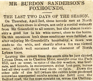 September 27th Croft Bridge. 8 A.M. Found several cubs in Dalton Wood but did not kill any. Rode the Bay pony. September 29th Girsby Bridge 7 A.M. Drew Hugill’s young plantation blank. Found three in Horsfall’s plantation and ran one into Staindale Gill and lost him. Found a brace in Allan’s and ran one into Graham’s Gill and then to ground in Beverley wood. Rode the Bay pony. October 4th Brass Castle. 6 A.M. Drew the Fighting Cocks whin blank. Found several cubs in Bumper Hall whin and after running several rings killed one at Sadberge hall. Very thick fog. Rode the Bay pony. October 30th Fighting Cocks. 11 A.M. Found a fox in Fighting Cocks whin and ran him round Sadberge Hall and into Bumper whin then back to Fighting Cocks and lost him. Drew Goosepool plantations blank. Found several cubs in Ld Londonderry’s whin and ran one to ground at Burn Wood and killed another in Goosepool plantations. Very wet and no scent. Rode the Bay pony. November 6th Piercebridge. 11 A.M. (Zetland) Found in Quarry Banks and ran through Selaby wood and on past Ingleton through Trundlewire and Copeland’s whin to Gordon Gill where he got to ground. Drew Trundlewire whin again but did not find. A very slow run and probably changed foxes in every cover we ran through. Rode Whitwell’s grey Brough Hill mare. November 13th Southlands Eaglescliffe. 11 A.M. Drew the plantations at Preston blank. Found in Elton whin, but the fox was so continually headed by foot people that we gave him up. Found in Bumper Hall whin and ran through Fighting Cocks past Burdon and back across the bottoms below Sadberge to Fighting Cocks and lost him. Found again in Bumper whin and ran through Goosepool towards Burn wood but he was headed at Ld Londonderry’s whin. Found a fresh fox in the whin and ran him into Goosepool plantations and killed him. Rode the Bay pony. November 20th Oak Tree 11 A.M. Found in Church Whin and ran down to Low Middleton where he was supposed to get to ground. Drew Newsham banks and Harrison’s Gill and Farrar’s whin blank. Found in Elton whin and ran through the plantation past Elton Hall and on through Burn Wood then turned to the right over the road between Goosepool and Long Newton and on to Barker’s plantation. Changed foxes in the plantation and ran a fresh one back nearly to long Newton and lost him. Rode the Bay pony. November 22nd Straggelton Gate. 11 A.M. (Zetland) Found in Nattras’s whin and ran a short ring round and back to the covert, hounds got him away again and ran to Walmire where they had to be stopped. Drew Clerveaux, Allan’s whin, Incle whin, Church whin and Sedbury all blank. Rode the Bay pony. November 26th Appleton Wiske 11 A.M. Found in the whin and ran slowly to Hornby Grange and lost him. Found three foxes at Welbury whin and ran past Wales’ whin to Picton where we lost him. Very slow run. Found a brace again in Appleton Wiske whin but scent was so bad hounds could not get them away. Drew Hornby whin blank. Rode Whitwell’s grey Brough Hill mare. November 27th Neasham. 11 A.M. Drew the Sockburn peninsula. Wilkinson’s, Birch Car and E. and W. Flats blank. Found in Maidendale whin and ran over the stell to the Darlington road at Herring’s farm and lost him. Drew the Far plantation blank. Found an outlying fox at Middleton St. George and ran round by the Asylum, through Wilkinsons round the Rifle Butts and back to Wilkinsons and lost him. Rode the Bay pony. December 14th Worsal Toll Bar. 11 A.M. Found several foxes at Kirklevington, hounds divided and each lot ran a fox to ground on the river banks. Found again at Kirklevington and ran nearly to Yarm and lost him. Drew Worsal whin, Long-roofed-house and Hugill’s young plantation blank. Found in Horsfalls plantation and ran through Beverley Wood and Allans to Forty Acres and lost him. Rode the Bay pony. December 13th Girsby Bridge. 11 A.M. Drew the Scar Hill plantation and the young plantation blank. Hit off the line of a fox on the river bank at Low Moor and ran very slowly through Peases and on to Hugill’s young plantation. Drew Pease’s blank. Found an outlying fox near Bell’s Gill and ran him to Staindale Gill and lost him. Drew Horsfalls and Beverley wood blank. Found a brace in Allan’s and ran one, very mangy, round the river bank and killed him near the Yorkshire Bats. Rode the bay pony. December 17th Halnaby 11 A.M. Drew Church Wood, Forty Acres, Birch Carr and Walmire blank. Found in Nattras’s whin and ran across to Banf House and lost him. Found again in Nattras’s whin and ran past Moulton whin, Uckerby whin and on past Moulton village to the Street near Gatherley Castle then turned back to the left and lost him near Uckerby village. Rode Double Post. December 18th Long Newton. 11 A.M. Drew Burn Wood, Londonderry’s whin and Goosepool plantations blank. Found in a small plantation below Goosepool farm house and ran fast past Bumper whin and the Burdon Earths to the stell at Red Hall farm then turned to the left over the railway and on towards the fighting Cocks and Darlington road and lost him in the belt on Herrings farm. Drew Bumper whin and Fighting Cocks blank. Rode the bay pony. January 8th The Kennels. 11 A.M. Killed a brace of mangy foxes in Birch Carr, after that had the usual Neasham day. There was a good scent and hounds ran well but never got away. Rode Double Post.