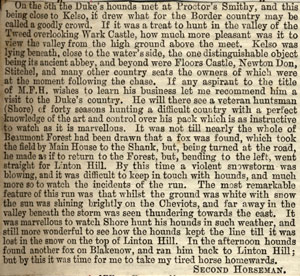 Found in Beaumont Forest and after running round for about an hour hounds went away towards the Smithy but turned to the right and ran down to the Shank and from there to the road between Yetholm and Morebattle where they lost their fox. Scent very bad and was not made any better by a heavy snow storm. Rode a hireling from Hall of Kelso.