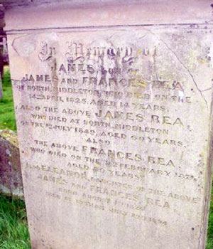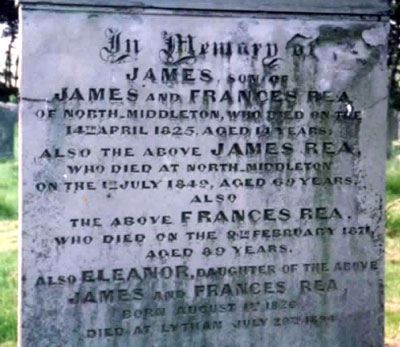 Frances and James had a large number of children. Records for Wooler show the baptisms of Alithea Frances, 2 May 1809, Eliza, 17 May 1812, William Grey Rea, 4 January 1814, Frances Isabella, 6 April 1815, John, 24 September 1816, George, 26 Dec 1817, Isabella Margaret, 7 July 1819, Margaret, 31 January 1822, Charles, 2 June 1823, and Eleanora, 1 August 1826. There must also have been a James born in 1811 since he appears on the grave stone at Kirknewton, dying at the age of 14 in 1825.