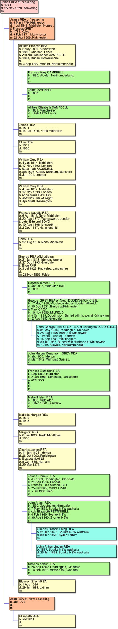 In 1883 George Grey Rea married his cousin Mary Grey the daughter of George Annett Grey of Milfield. He can be found on his own farming at Doddington in 1891, while his wife Mary and their son John George Grey Rea visits the Fair family at "Haighlands" Haigh Lancashire.