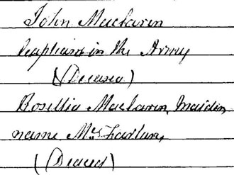Scottish registration of births, marriages and deaths began on 1 January 1855. They list the names of the parents of the deceased. Alexander Donald Mclaren's death certificate in 1871 was made by his second wife Elizabeth Soady who did not know the name of his first wife, which is listed as "unknown". He appears to have outlived his children. However the death certificate of Margaret Bartie in 1855 does have the name of her mother although it is difficult to decipher. (See below.) Possibly Rosetta Mcfarlan or it could be Mclachlan. (One of the witnesses at the baptism of Christian Wright, John Wright and Christian Nasmyth's daughter, in Glasgow in 1794 is a John McLachlan.)