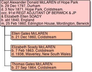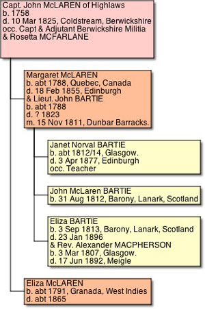 Further investigation of the Scottish census gives us the following family (left) which reveals that two of Capt. John McLaren's daughters were born in the West Indies and Canada. Margaret Bartie, aged about 45, is on the 1841 census at Coldstream, and with her sister Eliza McLaren on the 1851 census in Edinburgh, while Eliza McLaren, aged 70, is living with her niece Janet Bartie in Edinburgh in 1861. This appears to indicate that John may have been in the regular army before he was in the Berwickshire Militia.