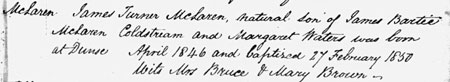Far left: John McLaren's grave can be found at Lennell Kirkyard two miles from Coldstream. The three McLaren graves are next to the three graves of the "Bartie" family who are probably relatives given that the name is used for two of his grand children.