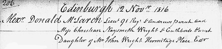 Christian Wright died in Edinburgh in 1801 and was buried on 28 February beneath Sir James Naismith's ?southmost stone. (Above) from Scotland's People website, Old Parish registers deaths: 685/1 980 370 Edinburgh, p.370 of 447. Her daughter Christian was 7 years old. When she was 22 she married Alexander Donald McLaren.