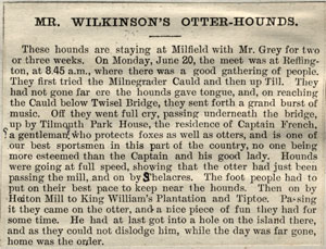 June 11 Twizell Bridge (Bucks Otter Hounds) about 9 A.M. Got onto a drag at once and ran it down to Tweed. Hounds were put across to the trees above the Milne Graden rocks and although they were keen did not really mark nor did they swim as if an otter was off when hunted down the pool. We tried down to the holt below the cauld but without finding then on down the inside of the island where they marked at a root; a terrier was put in and bolted a fox. We then went back to the trees above the rocks where they were as keen as ever. After they had been over a couple of minutes Willie Stodart viewed an otter put up 30 yards below. We hunted him down to the cauld and back a short way and as someone thought they saw him go over we tried round the island and then came back into the pool where hounds marked at a rock hole on the English side which was supposed to be dangerous for a terrier so we were obliged to leave it. June 13 Akleld Bridge. 7.15 A.M. “Glen” Drew up Glen without any drag to the Coupland fox holes, here hounds hit off a fresh drag in the backwater but as it had been rained on it was not very good. We ran it up to the slap at Coupland Mill where hounds marked. A terrier was put in and after some time bolted an otter which was headed back by one of the whips who was hunting hounds Mr. Gerald Uthwatt being laid off with gout, he was soon bolted again and we hunted him for 3 ½ hours or rather her as she turned out to be a bitch about 17 lbs (not weighed.) There must have been more that one otter off as two were viewed simultaneously at opposite ends of the pool. June 15 Red Scar Bridge 9.30 A.M. “Till.” Drew down the Milfield water and on down to the root above Etal cauld with hardly a sound. Hounds were inclined to mark at the root but left it. The drag below Etal improved considerably until we came to the islands. Hounds were again inclined to mark at the top island but it turned out to be nothing. When drawing the lower island we found a dead dog otter 25 lbs which had been dead several days. There were no marks of shot about him and the conclusion we came to was that he was Mondays Milne Graden otter which hounds certainly nipped. We drew down to Heaton Castle without finding. June 18th Sprouston 9.45 A.M. “Tweed.” There was a hot drag up to the Henderside Park drain but when run by the terrier it turned out to be blank. Then after trying up a quarter of a mile we drew down. Hounds marked in the plantation above Bamf Mill and we tried a terrier in but he was not there. The drag was fairly good all the way down to the Eden Mouth, there it improved considerable but we ran it out about a mile up. There was drag more or less down to Carham Wheel where we stopped. June 30th Glanton Station 7.30 A.M. “Aln.” We put in at Bolton bridge where there was a hot drag which took hounds up to Ld Ravensworth’s boundary where they were stopped as we had no leave from him. We then drew down through Alnwick Park to Alnwick without finding although the drag was good in places.