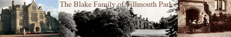 Blake family group. George Henry Ivar Grey at the back on the left. He is probably holding Hestia (Het) since she was the oldest born in July 1911, next to him is Kathleen Grey nee Blake, then Grandoo (Sir Francis Blake) ; on the right Marjory born 1890, aged about 22 in this picture, at the front Edward on the left, the next oldest born 1893, then Lina Blake nee Burns, and then Patrick the youngest, born 1904 so he is about 7 years old in this picture. Possibly taken as a celebration of their first grandchild. Probably taken at Tillmouth. This could be the edge of the tennis court. Thanks to Mary Branson for this photograph.