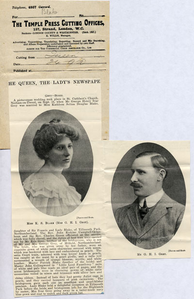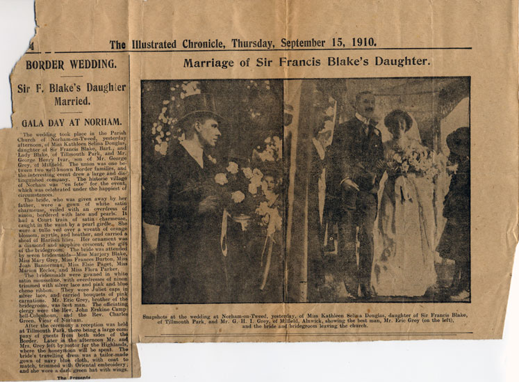 INTERESTING BORDER WEDDING. Mr G. H. I. Gray, Milfield, and Miss Blake, Tillmouth Park As a union between two well-known Border families, considerable interest attached to the wedding, in the ancient Parish Church of Norham, on Wednesday, between Miss Kathleen Selina Douglas Blake, daughter of Col. Sir Francis Blake, Bart., D. L., and Lady Blake, of Tillmouth Park, and Mr George Henry Ivar Grey, son of Mr George Grey, Milfield. The interesting event drew a large and distinguished company of guests at the ceremony. The historic village of Norham was “en fete” for the event, which was celebrated under the happiest of circumstances.