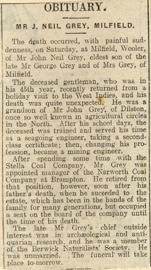 MR J. NEIL GREY OF MILFIELD The death occurred with painful suddenness on Saturday at Milfield, of Mr John Neil Grey, eldest son of the late Mr George Grey and of Mrs Grey of Milfield. The deceased gentleman, who was in his 45th year, recently returned from a holiday visit to the West Indies. He was a grandson of Mr John Grey, Dilston once so well known in agricultural circles. After his school days, the deceased was trained and served his time as a seagoing engineer, taking a second-class certificate; then, changing his profession, became a mining engineer. After spending some time with the Stella Coal Company, Mr Grey was appointed manager of the Naworth Coal Company at Brampton. He retired from that position, however, soon after his father’s death, when he succeeded the estate, which has been in the hands of the family for many generations, but occupied a seat on the board of the company until the time of his death. The late Mr Grey’s chief outside interest was in archaeological and antiquarian research, and he was a member of the Berwickshire Naturalists' Society. He was unmarried.