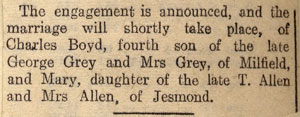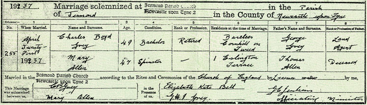 Charles and Mary married in 1937, when he was 49. Mary Allen came from Newcastle. Her father had something to do with shipping. She lived at Eslington Terrace in Jesmond, not far from Grosvenor Place where Boyd's brother Ivar lived. She hated the Grey family. They lived at Barelees. After his death Mary lived in Wooler in Winton House. She was fond of horse racing. She lived the last years of her life at Queen's House, a nursing home in Kelso, dying in 1980 aged 91.