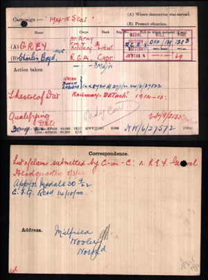 "C.B. Grey joined RGA in Nov 1914 by direct commission from Ld. Kitchener, was put in charge of Crammond Island in Forth defences.- Went to France early in 1915 was in charge of a battery of Vickers trench mortars at the battle of Loos and Hohenzollern Redoubt Joined the 23rd Siege Battery and went to the Somme. Took part in the following battles in the Somme 1916 advance first as Lieut in 23 Seige Battery later as adjutant to first Heavy Artillery Group Beaumont- Thiepval- Beaumont Havel- Contal Maison-Auvilliers-Bullecourt. He was also with the 1st H.A.G. in the Messines fighting as well as at Neuport and gained the Military Cross and parchment congratulation for ”his devotion to duty and valuable service during the operations of the XVth corps July to August 1917 from Lieut General Ducane- was through the Armentieres retreat from Bac St Maurs to Haazebruk 1918. Received parchment of congratulation for valuable service and devotion to duty from General Beavoir at Lisle. Got promotion to Captain in 1918. In Sept 1918 was specially selected for work with North Russia Expeditionary Force and joined the Slovak British Allies Legion in Oct 1918 on April 14 1919 was given the “Croise du Guerre” by French Government for military skill and having only 8 units of British French Russian and marines formed the splendid artillery force of the Slovak British Allied Legion on (on Vologda) Murmansk Railway of which he is CO “For skill and bravery in the fighting to there from Dec to April" 1919 Acting Major and G.R.A. on Railway Front Archangel. Mentioned in General Ironsides dispatches.