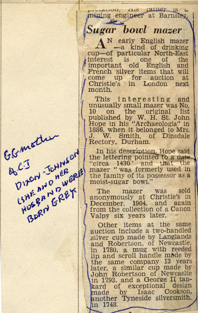 Some Dixon ancestors appear to have lived in Cumberland. This cutting is from the Dixon -Johnson scrapbook: "DIXON- on Aug 8, 1967 James Dixon of Millom and Hawkshead, aged 78. Requiem Mass in Chapel of Lorton Hall, Cockermouth, followed by private internment at Hawkshead. Telegraph 9 Aug 67."