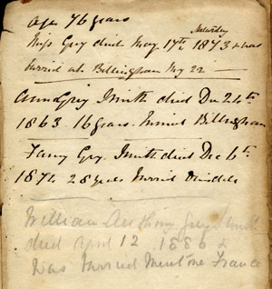 Wedding Day Feb 8th 1866 refers to the wedding of Cuthbert Greenwood Johnson to Maria Grey Smith in 1866. Maria Grey Smith's father was John William Smith, curate then rector, of Dinsdale, Durham. He was born John William Grey in Stockton but changed his name to Smith on 2 September 1833. He married, on 18 July 1839, Maria Grey, daughter of Lieut. Col. Robinson Grey of Norton. Their children on the 1851 census are Maria Grey Smith aged 8, scholar at Home, born Over Dinsdale. Joanna G. Smith aged 6, Fanny G. Smith aged 4, Anne G. Smith aged 3, and William A. G. Smith aged 2. Anna, Fanny and William's death are recorded on the back pages of the family bible above. The Miss Grey on the same page may be a sister of Maria Grey Smith. There is a probate record for 17 May 1873 for Eliza Anne Grey, late of Norton in the County of Durham Spinster, proved by William Robinson of Silksworth Esq. and John Grey of Parklands in the parish of Whitminster in the County of Gloucester Esq, the Brothers the executors.