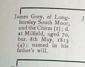 James Grey. The death at Milfield may be wrong, and the age 70 must be. These are Crawford Hodgson’s data which I accepted too trustfully. I had also however obtained a copy of the will of John Grey , wherein the testator says: - “I leave and bequeath to my three sons to wit, George Grey, William Grey, and James Grey, all my movable effects” etc and there is added (after probate) a note: “The above will was proved on or about 13 Jany 1779 by George Grey of Wingates Farmer, William Grey of Nesbit Farmer & James Grey of Longhorsley South Moor Farmer, the sons of the said deceased the Executors” And now I have your list of Extracts (which I return with best thanks) which gives the date of James’s birth 1761. Hence if the same James died at Milfield in 1813 he would have been 52 not to 70 years old.
