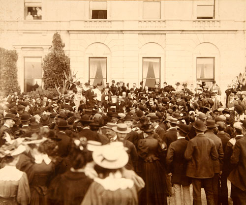 Left: A photograph of Curraghmore, found in the large Milfield Hill scrapbook. Marked on the mount as by Poole the Waterford photographer. It shows a welcoming party for two women. Possibly one is Louisa?