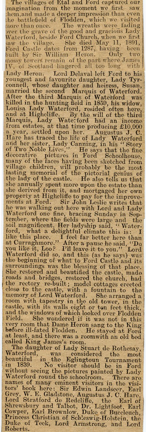 The Greys were estate managers for Ford. Ford was owned by the Delavals up to 1827 then by the Waterfords until 1907 and then the Joiceys. There are cuttings in the Milfield scrapbooks about each of these families. The third Marquis of Waterford (26 April 1811 – 29 March 1859) was killed in the hunting field and his widow Louisa Lady Waterford, developed Ford castle and village and painted the pictures in the