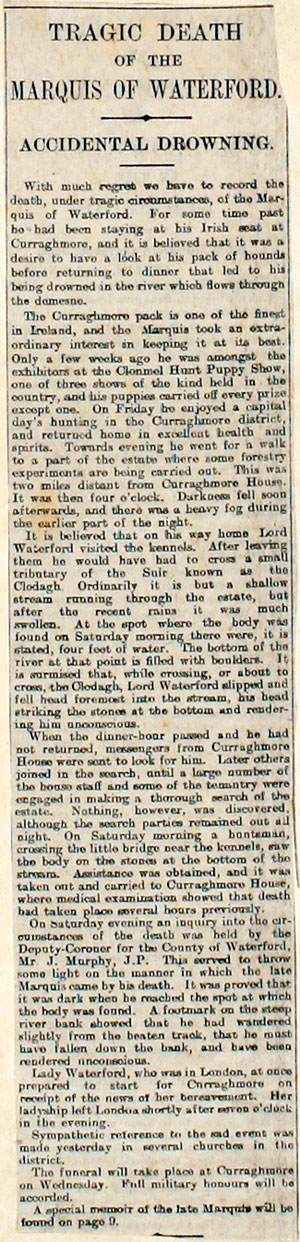 TRAGIC DEATH OF THE MARQUIS OF WATERFORD. ACCIDENTAL DROWNING. With much regret we have to record the death, under tragic circumstances, of the Marquis of Waterford. For some time past he had been staying at his Irish seat at Curraghmore, and it is believed that it was a desire to have a look at his pack of hounds before returning to dinner that led to his being drowned in the river which flows through the demesne. The Curraghmore pack is one of the finest in Ireland, and the Marquis took an extraordinarily interest in keeping it at its best. Only a few weeks ago he was amongst the exhibitors at the Clonmel Hunt Puppy Show, one of the three shows of the kind held in the country, and his puppies carried off every prize except one. On Friday he enjoyed a capital day’s hunting in the Curraghmore district, and returned home in excellent health and spirits. Towards evening he went for a walk to a part of the estate where some forestry experiments are being carried out. This was two miles distance from Curraghmore House. It was then four o'clock. Darkness fell soon afterwards, and there was a heavy fog during the earlier part of the night. It is believed that on his way home Lord Waterford visited the kennels. After leaving them he would have had to cross a small tributary of the Suir known as the Clodagh. Ordinarily it is but a shallow stream running through the estate, but after the recent rains it was much swollen. At the spot where the body was found on Saturday morning there were, it is stated, four feet of water. The bottom of the river at that point is filled with boulders. It is surmised that, while crossing, or about to cross, the Clodagh, Lord Waterford slipped and fell head foremost into the stream, his head striking the stones at the bottom and rendering him unconscious. When the dinner-hour passed and he had not returned, messengers from Curraghmore House were sent to look for him. Later others joined in the search, until a large number of the house staff and some of the tenantry were engaged in making a thorough search of the estate. Nothing, however, was discovered, although the search parties remained out all night. On Saturday morning a huntsman, crossing the little bridge near the kennels, saw the body on the stones at the bottom of the stream. Assistance was obtained, and it was taken out and carried to Curraghmore House, where medical examination showed that death had taken place several hours previously. On Saturday evening an enquiry into the circumstances of the death was held by the Deputy-Coroner for the County of Waterford, Mr J. Murphy, J. P. This served to throw some light on the manner in which the late Marquis came by his death. It was proved that it was dark when he reached the spot at which the body was found. A footmark on the steep riverbank showed that he had wandered slightly from the beaten track, that he must have fallen down the bank, and have been rendered unconscious. Lady Waterford, who was in London, at once prepared to start for Curraghmore on receipt of the news of her bereavement. Her ladyship left London shortly after seven o'clock in the evening. Sympathetic reference to the sad event was made yesterday in several churches in the district. The funeral will take place at Curraghmore on Wednesday. Full military honours will be accorded. A special memoir of the late Marquis will be found on page 9.