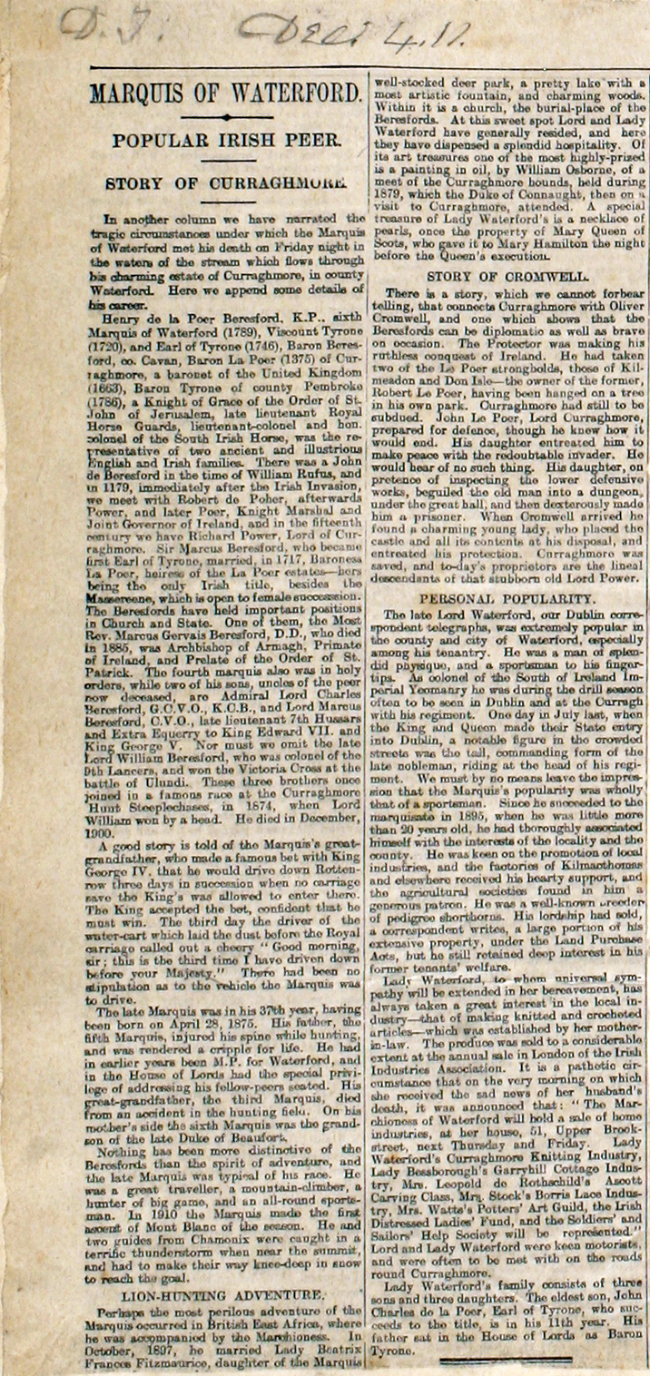 MARQUIS OF WATERFORD. POPULAR IRISH PEER. STORY OF CURRAGHMORE. In another column we have narrated the tragic circumstances under which the Marquis of Waterford met his death on Friday night in the waters of the stream which flows through his charming estate of Curraghmore, in County Waterford. Here we append some details of his career. Henry de la Poer Beresford, K.P., sixth Marquis of Waterford (1789), Viscount Tyrone (1720), and Earl of Tyrone (1746), Baron Beresford, co. Cavan, Baron La Poer (1375) of Curraghmore, a baronet of the United Kingdom (1663), Baron Tyrone of county Pembroke (1786), a Knight of Grace of the Order of St John of Jerusalem, late lieutenant Royal Horse Guards, lieutenant-colonel and hon. colonel of the South Irish Horse, was the representative of two ancient and illustrious English and Irish families. There was a John de Beresford in the time of William Rufus, and in 1179, immediately after the Irish Invasion, we meet with Robert de Poher, afterwards Power, and later Poer, Knight Marshal and Joint Governor of Ireland, and in the fifteenth century we have Richard Power, Lord of Curraghmore. Sir Marcus Beresford, who became first Earl of Tyrone, married in 1717, Baroness La Poer, heiress of the La Poer estates – hers being the only Irish title, besides the Massereene, which is open to female succession. The Beresfords have held important positions in Church and State. One of them, the Most Rev. Marcus Gervais Beresford, D.D., who died in 1885, was Archbishop of Armagh, Primate of Ireland, and Prelate of the Order of St. Patrick. The fourth marquis also was in holy orders, while two of his sons, uncles of the peer now deceased, are Admiral Lord Charles Beresford, G. C. V. O., K. C. B., and Lord Marcus Beresford, C. V. O., late lieutenant 7th Hussars and Extra Equerry to King Edward VII. and King George V. Nor must we omit the late Lord William Beresford, who was colonel of the 9th Lancers for, and won the Victoria Cross at the Battle of Ulundi. These three brothers once joined in a famous race at the Curraghmore Hunt Steeplechases, in 1874, when Lord William won by a head. He died in December, 1900. A good story is told of the Marquis’s great-grandfather, who made a famous bet with King George IV, that he would drive down Rotten-row three days in succession when no carriage save the King’s was allowed to enter there. The King accepted the bet, confident that he must win. The third day the driver of the water-cart which laid the dust before the Royal carriage called out a cheery "Good morning, sir; this is the third time I have driven down before your Majesty." There had been no stipulation as to the vehicle the Marquis was to drive. The late Marquis was in his 37th year, having been born on April 28, 1875. His father, the fifth Marquis, injured his spine while hunting, and was rendered a cripple for life. He had in earlier years been M. P. for Waterford, and in the House of Lords had the special privilege of addressing his fellow-peers seated. His great-grandfather, the third Marquis, died from an accident in the hunting field. On his mother's side the sixth Marquis was the grandson of the late Duke of Beaufort. Nothing has been more distinctive of the Beresfords than the spirit of adventure, and the late Marquis was typical of his race. He was a great traveller, a mountain-climber, a hunter of big game, and an all-round sportsman. In 1910 the Marquis made the first ascent of Mont Blanc of the season. He and two guides from Chamonix were caught in a terrific thunderstorm when near the summit, and had to make their way knee-deep in snow to reach the goal. LION-HUNTING ADVENTURE Perhaps the most perilous adventure of the Marquis occurred in British East Africa, where he was accompanied by the Marchioness. In October, 1897, he married Lady Beatrix Frances Fitzmaurice, daughter of the Marquis of Landsdowne, and it was shortly afterwards, while trekking in the big game country, that they were surprised by a lion, which bounded out of a thicket and knocked the Marquis down. The huge animal landed on the Marquis’s shoulder, and severely injured him. Two of the gun-bearers came to his lordship’s assistance, and the lion, with a spring, knocked one of them over and hurt the other. Lady Waterford was a spectator of this scene, only a few yards away. She stood bravely with a gun at her shoulder ready to fire, but afraid to do so lest she should hit her husband or one of the bearers. Happily the beast’s attention had been drawn to the two men; the Marquis reached his gun, fired straight into the lion’s eye, and killed it instantly. Even Livingstone’s escape at Mabotsa was hardly more wonderful. That lion’s skin is one of the most famous trophies at Curraghmore. HUNTING CAREER A shadow which will not easily be removed has been cast over Irish hunting circles by the death of one of the foremost Masters of Foxhounds on that side of the St George's Channel. The Marquis inherited all the love of fox-hunting which has been so characteristic of the Beresford family, and when in 1906 he agreed to take the Mastership of the Waterford Hounds, Irish sportsmen were delighted, recalling the glories of the old Curraghmore Hunt, established by the third Marquis about sixty years previously. The present Waterford Hunt differs from the original Curraghmore Hunt in that the hounds belong to the country, and are a subscription pack. But this did not deter the Marquis from endeavouring to breed a pack as brilliant as any which had previously hunted Waterford, and it can safely be said that no hounds have so greatly improved in recent years as those now kennelled at Curraghmore, where the Master provided a new home for them soon after accepting the command of the pack. As an example of Lord Waterford’s efforts to improve the kennel, it may be mentioned that he gave 360 guineas for two couples of Mr Frank Bibby’s entered bitches at the sale of the North Shropshire Hounds, and
