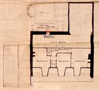 The main front stairs had curving polished banisters and metal cast iron uprights. One of Jack Grey's friends fell downstairs and smashed one off. These stairs were sold when the house was demolished and may still exist somewhere. There was a landing where the stairs turned with a window which had a metal horse and foal on the window sill. At the top of the stairs an arch opened onto a corridor which led to the bedrooms at the front of the house. In a recess was a trunk which held silver that wasn't being used and important documents. Facing the top of the stairs the front bedroom above the smoking room was used by Kathleen and Ivar Grey before WW2 and a door led to Ivar's dressing room which had one wall made into a huge cupboard with large sliding doors. Jack Grey used it later on, although only in the summer; he moved to the one above the kitchen for warmth in the winter. Along the corridor to the right was the blue room, a small single room which Angela Grey used when the house was divided up. This room was where Josephine Butler was born. Two steps led up to the big west bedroom which Kathleen Grey used in in the 1950s. (She kept a little lacquer box in there full of oddities which included a bracelet made of elephant's hair.) Returning to the top of the stairs the landing on the left led to another bedroom which had a single iron bedstead, and was quite dark, due to the trees outside. Next to it the bathroom which had a tiny triangular sink outside of it hidden behind two wooden doors. The bathroom overlooked a flat roof where Kathleen put out bread for the birds. A bedroom was beyond this which was used by Lina Grey. In the 50s it contained a strange and wobbly wardrobe which was circular and whose door slid into itself to open. Before the house was divided up in the 1950s if you turned right at the top of the stairs before going through the arch there was a swing door which led through to the other wing. Immediately behind the door was another bedroom and beyond that two steps which led to where the back stairs came up. A narrow flight led to the tower room and the box room where the water tank was. It was often full of bats. This part of of the house, with its 3 bay windows was later lived in by Anne Mildred. Returning to the landing just inside the swing door on the left a spiral staircase curved up to the attics. The attics were made for the maids and it was rumoured that the parapet in front of the windows, a later addition to the house, was built to stop the maids seeing out and being able to wave at the boys in the village. These rooms had sloping ceilings and were full of fascinating junk in the 1950s; more stuffed animals and lots of old swords. These were later sold to a specialist in Alnwick. From here you could reach the roof and the flagpole.