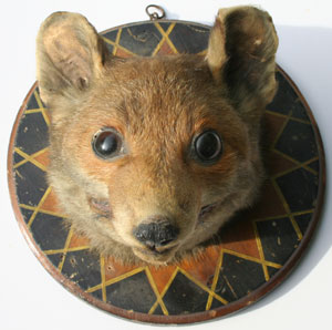Far left: Fox's mask in possession of author of this web site. Left: Lot No.568 from on-line auction catalogue of Lawrence and Co.' A fox's mask mounted on an oak shield with label inscribed " Milfield Hill 1936" the reverse with printed account of the day with the North Northumberland. £20-30'