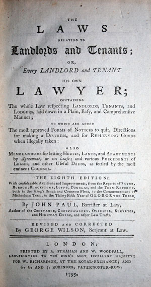 Left: Laws relating to landlords and tenants, the front page of book dated 1795 with the signature of Eric Ida Grey on frontispiece.