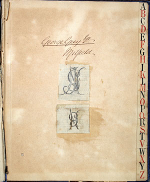 Left: Front page of small scrapbook with George Grey's signature and Neil Grey's hand drawn monogram.